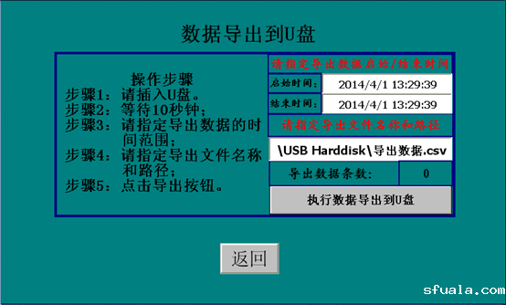 用户如果需要对历史运行的数据导出以便查看,可以把U盘插入触摸屏背面的USB口上,然后进入数据导出画面,设定需要导出的那一段时间(起始时间和结束时间)的数据。然后点击执行导出数据到U盘的按钮,即可以把数据导出到U盘。用EXCELL软件进行打开和查看。