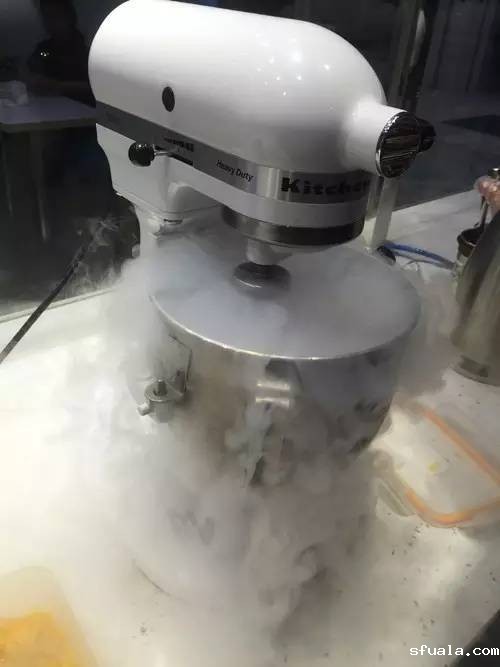 液氮冰淇淋:液氮-196度,当它迅速蒸发时,释放出剧烈的烟雾。待雾开云散,冰淇淋也完成了急速成形,相比传统冰淇淋,新鲜出炉的液氮冰淇淋的质感紧实,层次丰富,口感更佳。